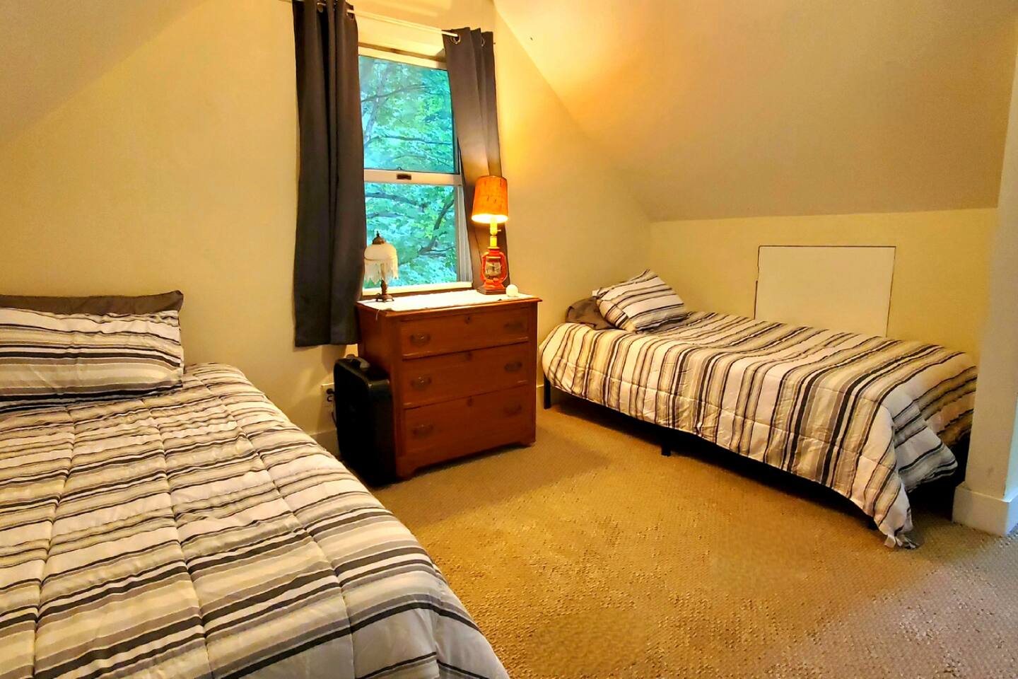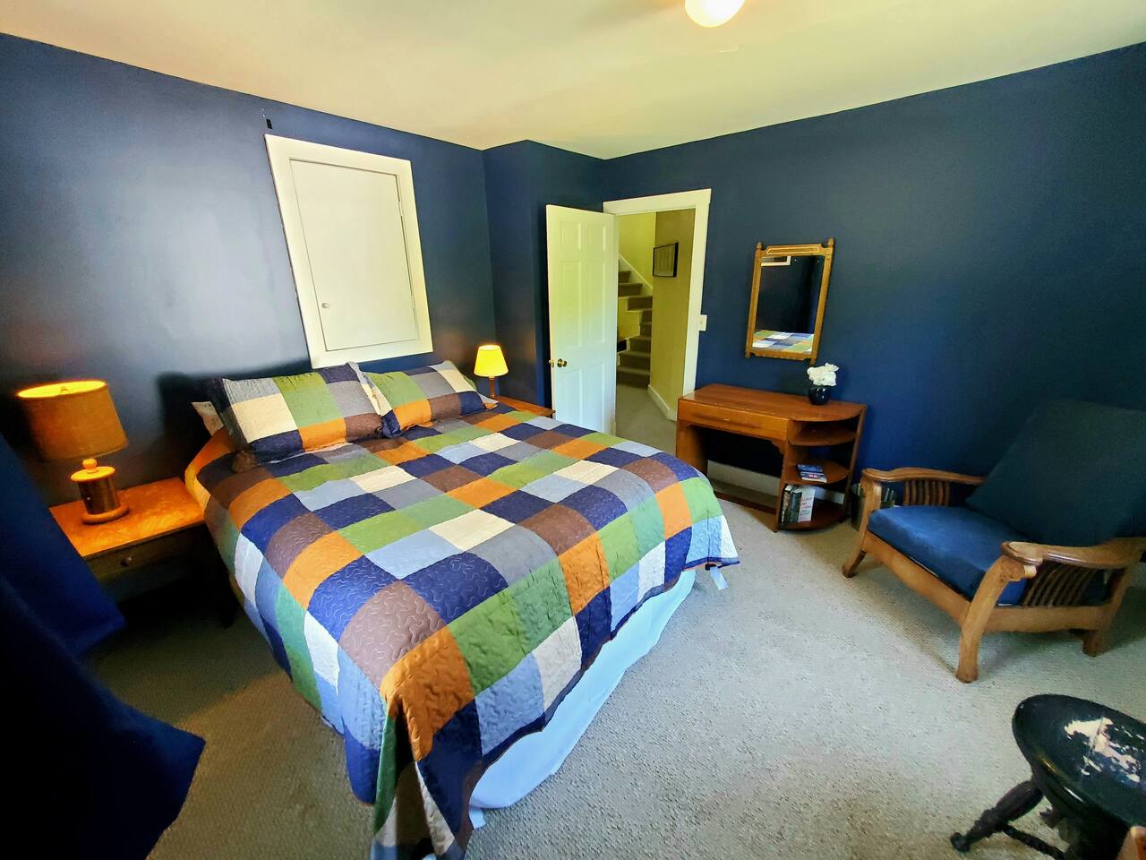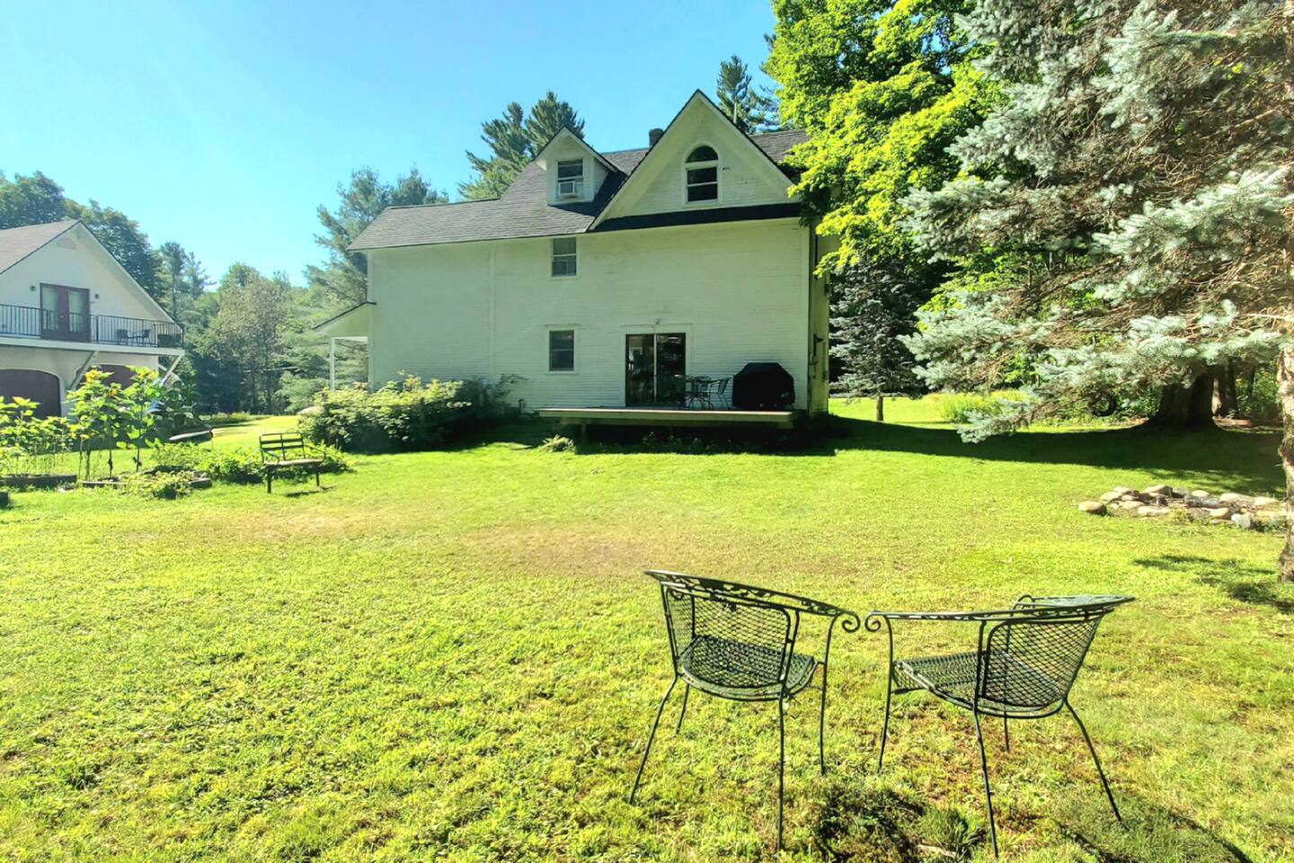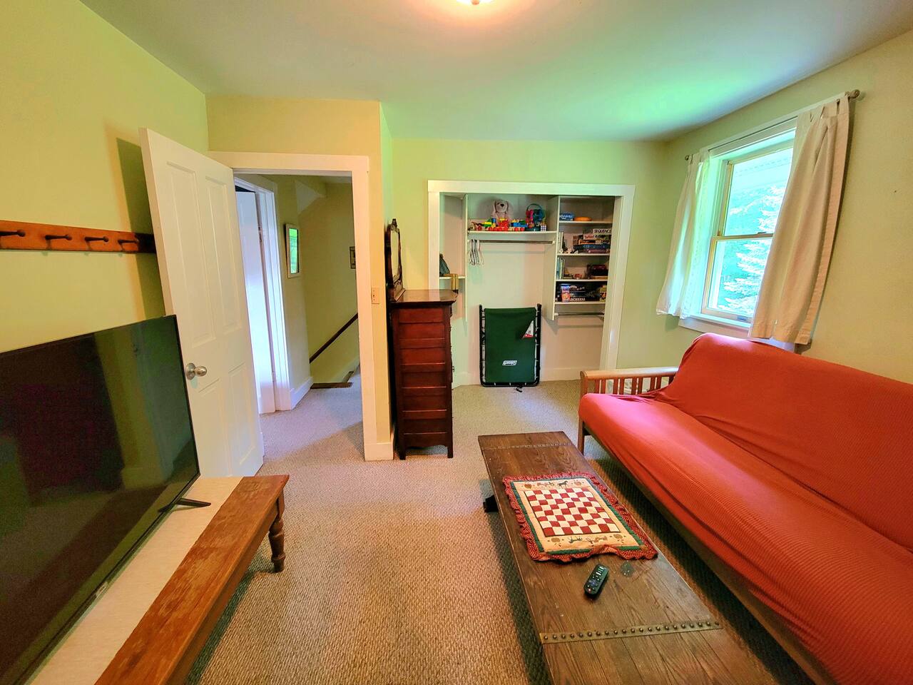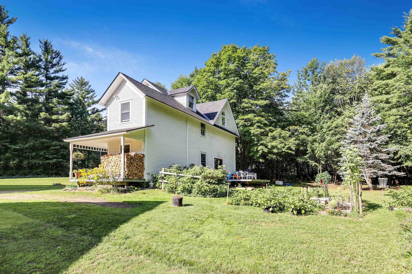 Recently updated with smart TVs throughout and high speed internet. Vermont country living with modern amenities! All essential cooking and dinnerware are provided in the full-sized kitchen. There are six smart televisions for everyone to enjoy. Hulu Live TV with Disney+ & ESPN, gigabit internet, and Wifi are included. There's even a popcorn machine! For convenience we use a Smart lock. After booking you'll receive a message with a unique key code good for the duration of your stay. Guests will have access to all bedrooms: Bedroom 1 (Queen) and a full bath with combo washer/dryer are on the main floor. Three bedrooms are on the second floor, Bedroom 2(Queen), Bedroom 3(King) and Bedroom 4 which has a Twin bunk bed and a single Twin bed. The game room futon doubles as additional sleep space. The third floor loft has a private bedroom with a King size bed(Bedroom 6). Please be aware: The 5th bedroom(2 Twin beds) is not completely private. Bedroom 6(3rd floor with King Bed) is accessed through Bedroom 5. There is no dedicated door for the twin beds on the third floor but we have provided a large room divider for privacy. We also have a folding cot if needed for additional guests. A Combo Washer/Dryer is available for you to use. In the back yard you'll find a deck with deck chairs, a propane grill and access to the Jay Branch Brook. Additional folding chairs and lawn games are available in the cabinet in the entry room. We are happy to allow guests to host events but they will be subject to host approval and venue fees. While we are dog friendly, we require that guests do not leave their pet unattended unless they can be crated. We prefer only 1 dog per reservation but will consider additional on a case by case basis.