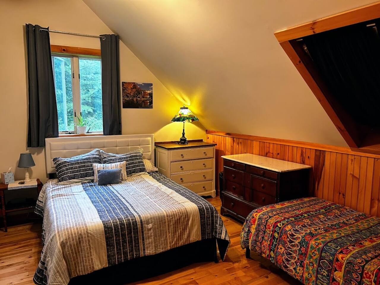 You are booking the Entire Property (The Main House + The "Annex" Apartment). This setup is ideal for groups who want to be together but need a little separation. 🏠 UNIT 1: The Main House (The Gathering Spot) A rustic yet updated Vermont farmhouse that serves as the social hub. Sleeps 14: Spread across 3 floors. Social Spaces: A cozy living room with a wood stove for après-ski warm-ups, plus a separate "Game Room/Kid Zone" with a futon and TV—perfect for sending the kids to watch a movie while adults enjoy the main fire. Kitchen & Dining: Full kitchen equipped for large meals. Baths: 2 Full Bathrooms (one with a clawfoot tub). 3rd Floor Note: The third floor is a finished loft space. To reach the King Bedroom (Bedroom 6), you walk through the Twin Bedroom (Bedroom 5). A room divider is provided for privacy. Tech: High-speed Wi-Fi and Smart TVs in almost every room. Comfort: On-Demand Hot Water (no cold showers, even with a full house!). 🏠 UNIT 2: The Apartment (The Private Wing) Located right next door, this unit has a fun "Retro Ski Chalet" vibe featuring classic wood paneling and a spiral staircase. Sleeps up to 6: Ideal for the grandparents, a family with a baby, or the night owls of the group. Amenities: Its own full kitchen, washer/dryer, living room with Smart TV, and its own cozy wood stove. 1.5 Baths: A huge bonus for morning prep time! Note: This unit features a spiral staircase to access the 2nd floor living room and bedroom. 🛌 Sleeping Arrangements (Sleeps 20 Total) Bedroom 1 (House): Queen Bed Bedroom 2 (House): 2nd floor, King Bedroom 3 (House): 2nd floor, Queen Bedroom 4 (House): 2nd floor, 3 Twins(one bunk) Bedroom 5 (House): 3rd floor, 2 Twins Bedroom 6 (House): 3rd floor, King Bonus Room (House): Futon (Great for kids) Bedroom 7 (Apt): Queen Bed + Twin Bed Living Area (Apt): Full Futon + Air Mattress 🌲 The Outdoors The Brook: The shallow Jay Branch Brook runs right behind the property—perfect for a calming morning walk. Fire Pit: A shared fire pit in the backyard for evening s'mores (wood available!). Play: A tire swing in the yard for the kids. Why Groups Love Us: 5 Minutes to Slopes: You can beat the traffic to the first chair. Two Kitchens: Prep a massive Thanksgiving dinner or team meal without bumping elbows. No Hot Water Wars: On-demand hot water at the house. Tech: High-speed Gigabit Wi-Fi and Smart TVs with Disney+, Hulu, and ESPN included in both units. This is a combination of the following listings: https://www.airbnb.com/rooms/592079433797856691 https://www.airbnb.com/rooms/1239227007587817685